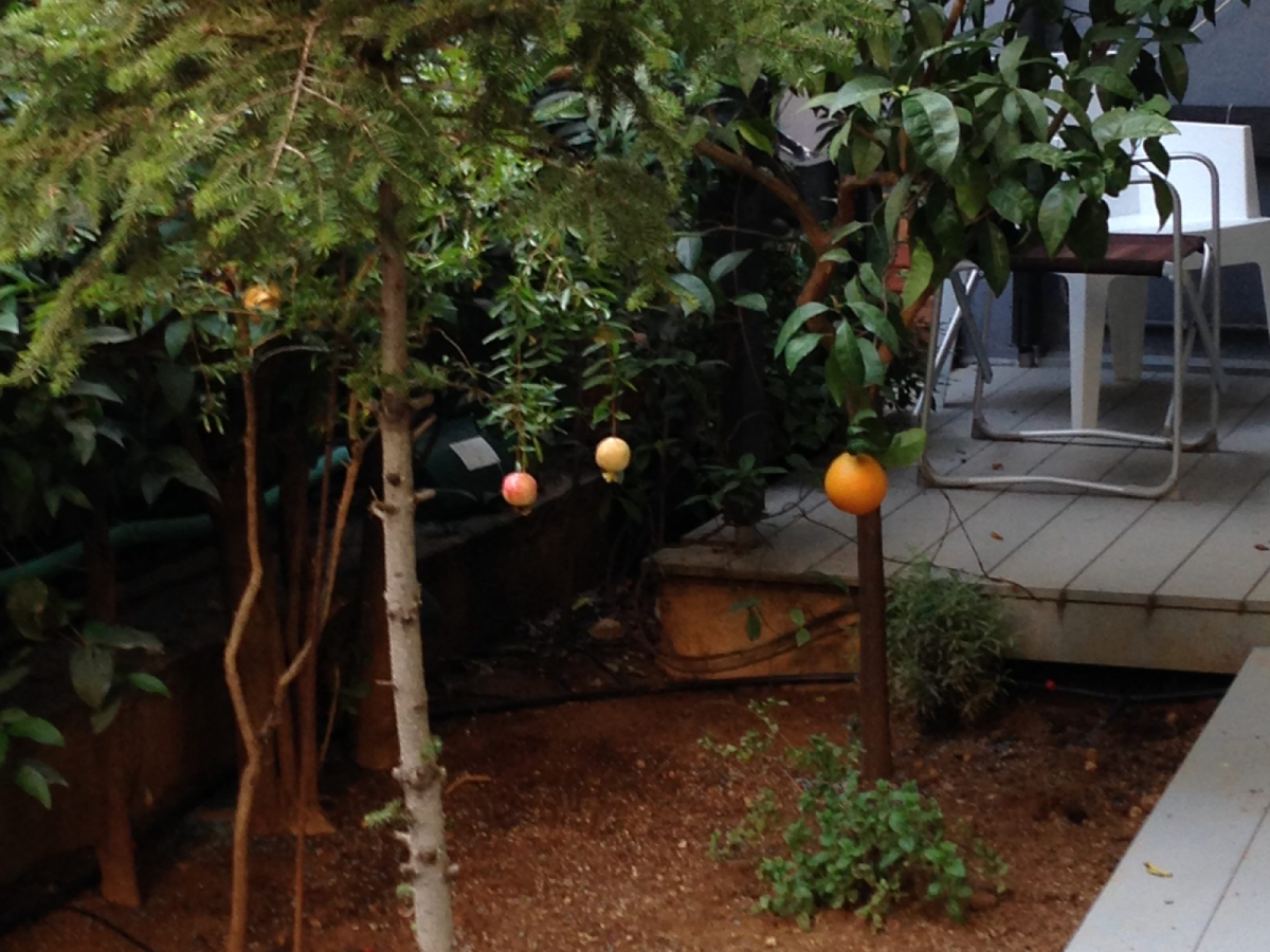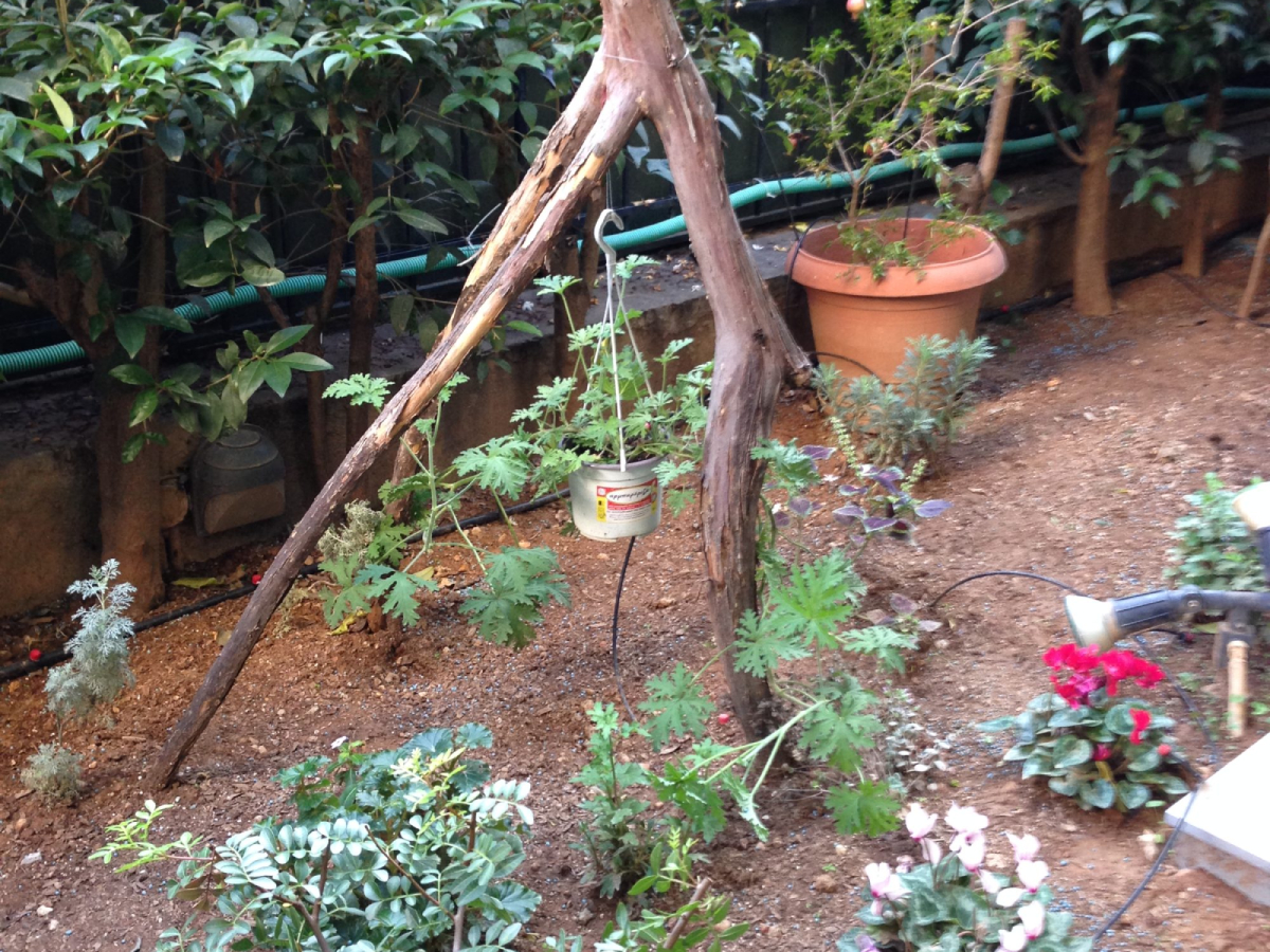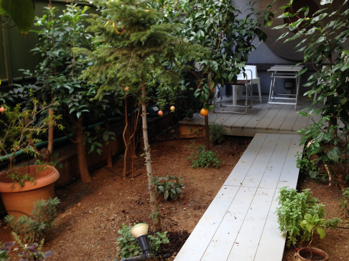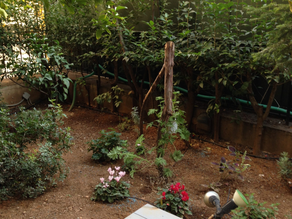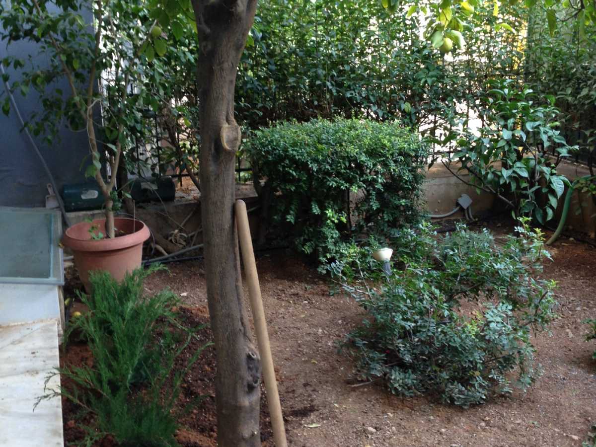 Η αυλή εκτείνεται στο πίσω μπαλκόνι της κατοικίας. Ο κήπος αρχικά περιλάμβανε 2 μεγάλες λεμονιές από τη γιαγιάς της. Εμείς, σε βάθος χρόνου έχουμε επιμεληθεί για όλη την διαμόρφωση του κήπου. Προσθέσαμε φυτά περίφραξης με λιγούστρα, όπου είναι γένος αειθαλών ή φυλλοβόλων θάμνων, οι οποίοι μπορεί να γίνουν δέντρα μικρού ή μεσαίου μεγέθους. Παράλληλα λόγω της μεγάλης αγάπης της για τη μαγειρική, επιλέχθηκαν αρωματικά φυτά όπως ρίγανη, μαϊντανός, θυμαρολέμονο, δυόσμος για να τα προσθέτει φρέσκα στα φαγητά της!