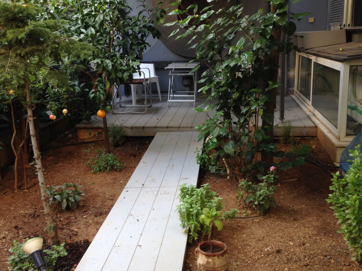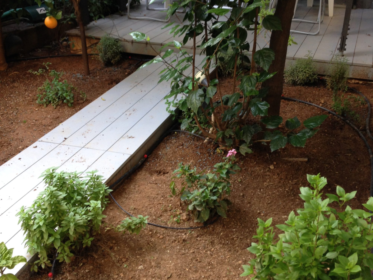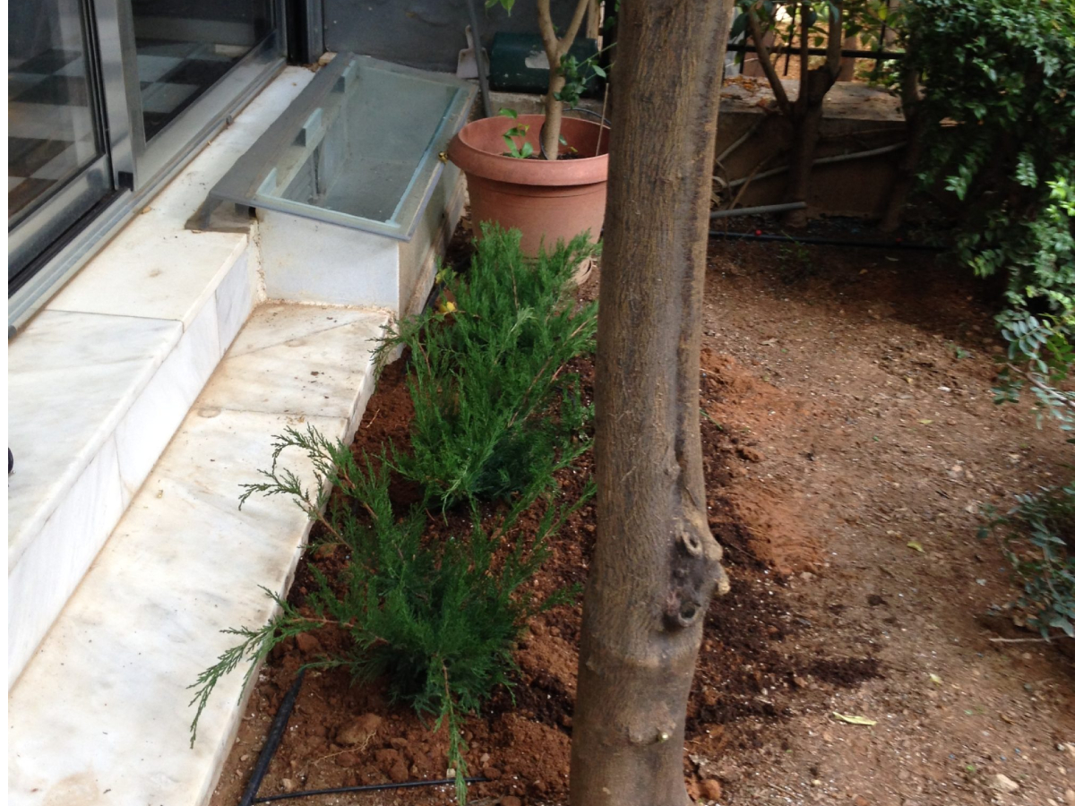 Επιπλέον κάτι πολύ χρήσιμο ήταν η επιλογή του φυτού γουνίπερους ή άρκευθος με σκοπό την εδαφοκάλυψη μπροστά στη τζαμαρία της μπαλκονόπορτας έτσι όταν βρέχει να μην λερώνεται το τζάμι από σταγόνες νερού και χώματος. Επίσης, τοποθετήσαμε αυτόματο πότισμα για να ωφελήσει το σπίτι της, βοηθώντας τον κήπο της να ανθίσει όλο το χρόνο, με ελάχιστη προσπάθεια – εξοικονομώντας χρόνο και χρήμα. Τέλος, σκεφτήκαμε οτι θα ήταν φρόνιμο να κατασκευάσουμε έναν ξύλινο διάδρομο για να μεταφέρεται από το σαλόνι της απευθείας στον κήπο της, όποτε το επιθυμεί χωρίς να λερώνεται από χώματα.